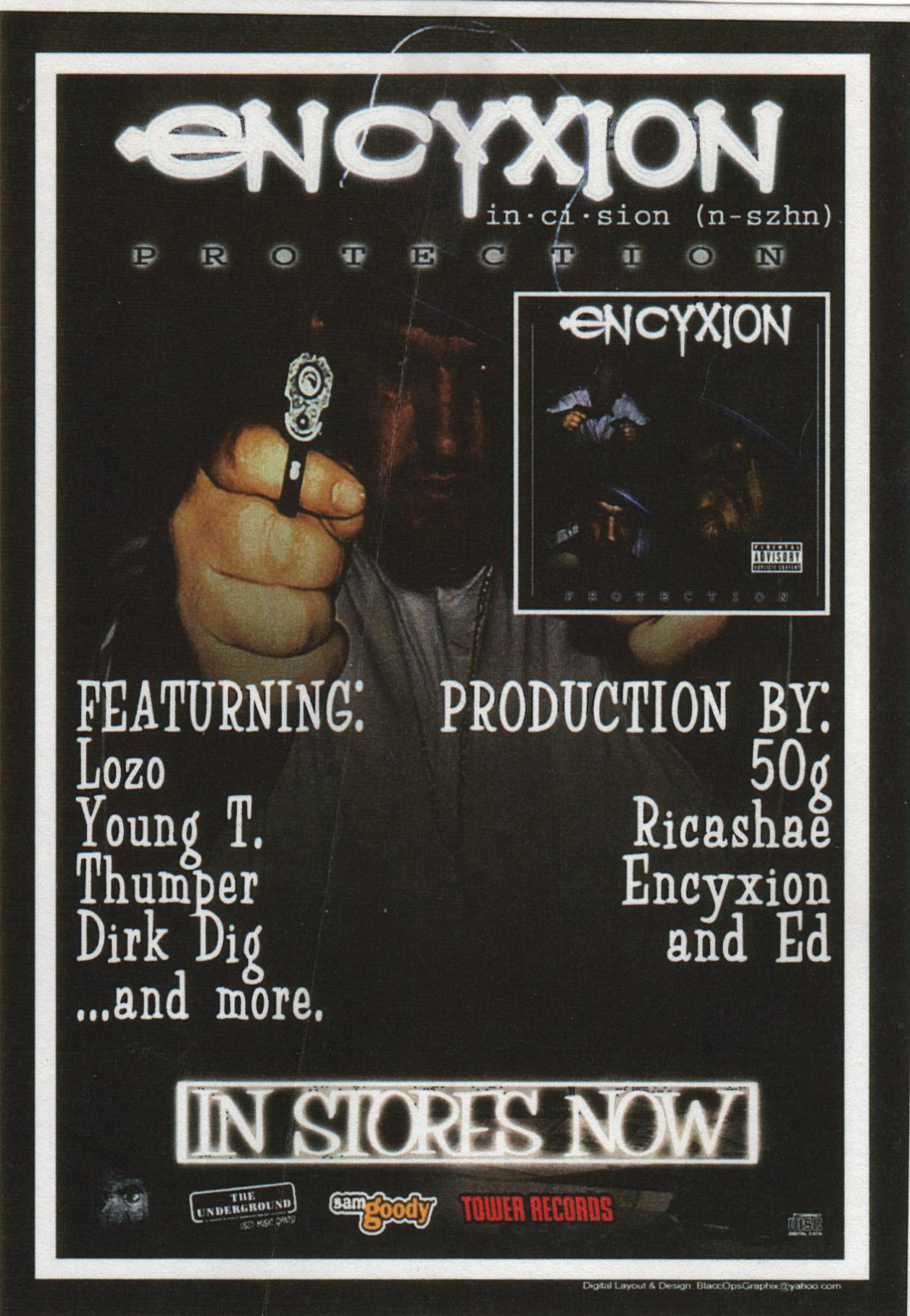 ENCYXION (INSISION) THA ANGRY POET IS A SACRAMENTO NATIVE FROM NORTH HIGHLANDS AREA. AT THE AGE OF 16 HE DECIDED DUE TO A CHANCE TO APPEAR ON AN ALBUM HE WAS GOIN TO START WRITING RAPS INSTEAD OF DOING A FREESTYLE IN A CIRCLE. HE QUICKLY AFTER PAYING HIGH DOLLAR FOR STUDIO TIME NEW HE NEEDED PRACTICE AND WAS WAISTING MONEY ON THIS STUDIO TIME, HE PURCHASED COMPONENTS FOR A HOME BASED STUDIO. SINCE THEN HE HAS UPGRADED FROM A 4 TRACK TASCAM AND A GENERIC MIC TO QUALITY MICS HIGH DOLLAR DRUM MACHINES, KEYBOARDS, DIGITAL AUDIO RECORDERS, AND OTHER SOUND EQUPMENT. ALTHOUGH HE CAN PRODUCE, RAP, AND ENGINEER HE REALLY WANTS TO FOCUS ON HIS WRITING AND ACTING. ENCYXION IN HIS YOUTH WAS IN TROUBLE WITH THE LAW FOR NUMEROUS THINGS, ALSO AROUND THE AGES 12-13 WAS SHOT THREE TIMES AFTER MANY SHOTS WERE FIRED THROUGH THE FRONT WINDOW OF THE HOUSE WHERE HE WAS (A DRUG HOUSE). EVERY DAY THAT PASSES HE GAINS MORE SKILL AND TALENT PRACTICING HARD. HE DOES NOT WANT TO MOVE ON TO THE BIG LEGUES UNTIL HE IS READY TO ALOT OF TRAVELING, HIS PLANS ON A FIRST STEP WERE CONSISTING OF GETTING A DEMO TOGETHER AND TAKING IT DOWN TO LOS ANGELAS IN HOPES TO GET HIS DEMO IN THE HANDS OF RECORD COMPANIES. HE AT THIS TIME HAS 1 FULL LENGTH ALBUM TITLED "PROTECTION" AND MANY UNDERGROUND ALBUMS HE HAS PUT OUT FOR STREET CREDIBILITY. CURRENTLY ENCYXION HAS OVER 400 SONGS SOME OF THEM NOT SO GREAT OTHERS WORTHY OF INDUSTRY STANDARD RELEASES. ENCYXION WORKS HARD IN HIS STUDIO AND ON HIS MUSIC ALTHOUGH HE HAS MANY BARRIERS HOLDING HIM BACK. IN 2006 HE WAS ARRESTED DURING A RAID OF HIS HOME FOR ILLEGAL SALES OF NARCOTICS, 2 GUN CHARGES, & CHILD ENDAGERMENT. SINCE THEN HIS LIFE HAS TAKEN A DRAMATIC TURN FOR BETTERING HIMSELF. HIS DAUGHTER WAS TAKEN AND PLACED IN A FOSTER CARE HOME, SO FIGHTING TO GET HER BACK CAME BEFORE ALL. ON OCT. 31 HE WAS FOUND GUILTY AND SENTENCED TO 270 DAYS IN THE SAC. CO. JAIL A FAR BID FROM HIS ORIGINAL STANDINGS OF UP TO 6 YEARS IN PRISION. AFTER HE WAS SENTANCED THE JUDGE REFERED HIM TO THE HOME DETENTION PROGRAM WITH ENCYXIONS DAUGHTERS CONCERN AS A MAIN PRIORITY, WHERE HE REMAINS NOW UNTIL JUNE 07. AT THIS TIME HE CURRENTLY HAS PUT TOGETHER A DVD PEICED UP OF MANY OF HIS TIMES FROM RIGHT BEFORE HIS RECENT ARREST AND IT WILL BE RELEASED IN JUNE 07 TITLED "BLOCCSHOW". SIDESHOW FOOTAGE, FIGHT FOOTAGE, AND LOTS OF GOOD MUSIC BEHIND IT ALL