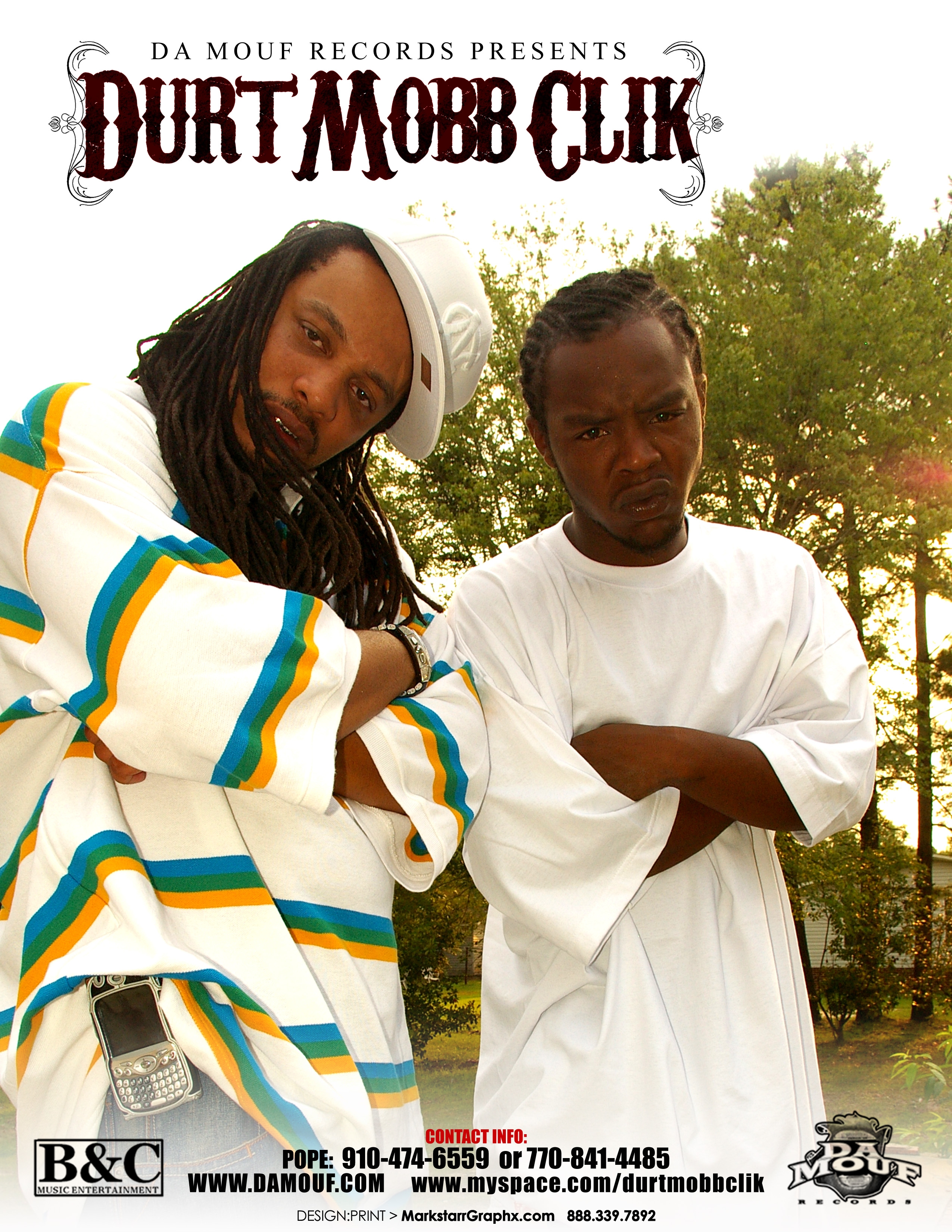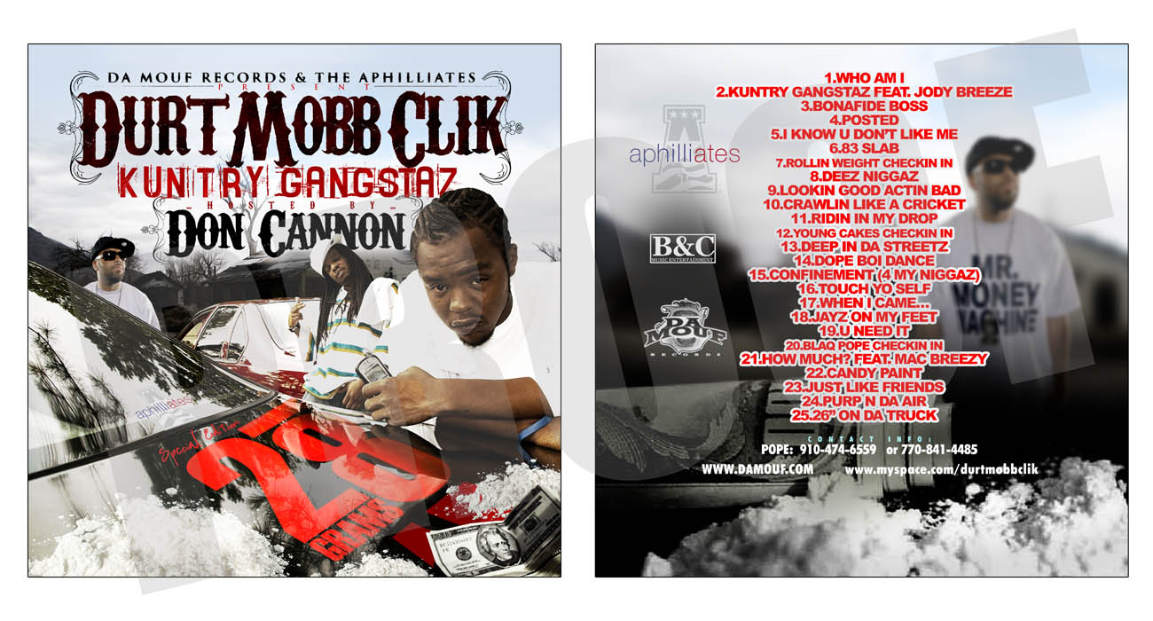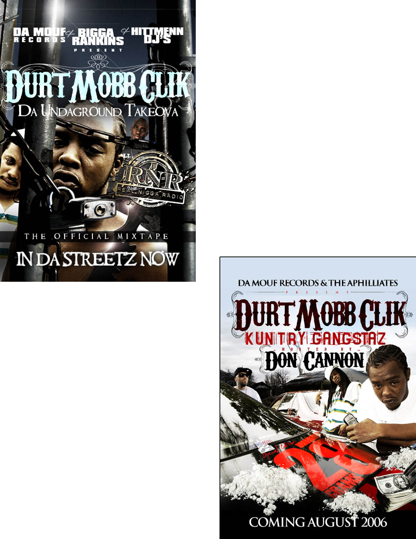 (DA MUSIC PLAYING ARE NEW SONGS, NOT FROM DA SHOWN MIXTAPES, THAT'S SOME MORE FIRE FOR YA) !!!! DURT MOBB CLIK: ABOUT US !! It was only a matter of time before two-man tag team Durt Mobb Click sprouted past the tobacco fields of North Carolina onto independent fruition from the Atlantic to the Pacific. Deeply seeded with distinct, homegrown wordplay, infectious, head-bobbing hooks and versatile styles reminiscent of Big Boi and Dre 3000 in their early years, this Fayetteville-based collective will soon have us all addicted to their charismatic charm and robust musical flavors. Comprised of 25-year-old hometown legend Rollin' Weight and 20-year-old titan Yung Cakes, Durt Mobb Clik is by far the flyest duo to ascend from the Tar Heel State since the Wright Brothers. Fueled by rapidly emerging independent powerhouse label Da Mouf Records since 2004, the group has shelled out mix tapes like a fresh pack of casino 52s and spawned a legion of fans along the Eastern seaboard. And now, they're back on deck with a one-two knockout combo special edition mix tape of the Aphilliates DJ, Don Cannon's 28 Grams series entitled Kuntry Gangstaz and Hittman DJ Bigga Rankins' Real Nigga Radio mix tape series entitled Da Undaground Takeova. "We are southern; we get influences from all over the south, so the styles are going to be similar to other Kountry Gangstaz around the world," explains Rollin' Weight. "But being from Carolina, we gotta represent for the millions of our people who need representation." Born Dalvin Lewis in Fayetteville's Murk community (short for main thoroughfare Murchison Road), Weight hasn't always been the flame-throwing microphone mangler you hear wrecking mix tapes today. Coming up, everyday was a struggle for this young survivor. "Murk is the hood. It's the poor part of town- it’s the ghetto, the trap, or whatever you wanna call it," he clarifies. "Everybody is grinding and trying to get paid. You gotta watch your back at all times and be on guard." He wouldn't change his street hustle until bumping into late-90s Washington, D.C.-based group Section 8 Mob as they were in town looking for new talent. Pressing his luck, he went into the studio and recorded a three-song demo for the group. But instead of submitting it to Section 8, he recorded even more songs to make an EP in 2000 called Sneak Preview and sold copies hand to hand across town. His buzz grew almost instantly. Two years later, he came back with his first album Out the Gate. In 2003, he dropped Out The Gate 2 and Out the Gate 3 in 04. By this time, Weight had become a local legend, and upstart local label Da Mouf Records was looking for a hood rich rapper. "I heard about Rollin' Weight in 1999, in 2000, in 2001. I kept hearing about him. I figured he was already with a label because Of the way his name was buzzing," remembers label CEO Blaq Pope. "He had a buzz in 20 or 30 cities and hick towns, in the clubs and on radio. Rollin' Weight was selling cds at stop lights, stop signs, outside the malls, in stores, at gas stations everywhwere. I was impressed with his grind." The perfect contrast to Weight's gruff on the mic, experienced in the game and mature demeanor is his partner in rhyme - a scrapping hard head named Yung Cakes. Raised in Fayetteville's Bonnie Doone community, Cakes has witnessed trials way past his two decades on this planet. "I done been through things that men twice my age have gone through," he says. "I done seen people get beat to death, been shot at by dudes I didn't even know. Hell, I done even been shot. But I ain't trying to glorify none of it. It's nothing different from the average hood story, what people do everyday around the world." But while the streets constantly beckoned, music naturally flowed through his veins. His father used to tap dance and play trumpet; mother used to sing and uncle owned a club across the street from the projects where Cakes grew up. Unfortunately, though, the hood took him under when he was sent to a detention center at the age of 13 then to training school until his 16 birthday. "When I got locked up, that was the best time for me as far as music," Cakes recalls, " because I was able to sit down, focus and be clever with my wordplay. I had a clear head." So when he touched down on free ground, he pursued a career in rap with a vengeance. Appearing in open mic nights in several clubs across town, he would eat rappers for dinner and have the rest of their crews for dessert. His buzz grew past the clubs to the ears of Blaq Pope who signed Cakes to the label to complete their music movement. The group's first projects were a well respected mix tapes, Talk of the Town and EP Get That Money Right both released in 2004. They came back the following year with a DJ Dutty Laundry-hosted mix tape entitled Hood Talk with cameos from Jazze Pha, David Banner, Gucci Mane, Bone Crusher, Rasheeda and their rowdy anthem single "Riot" featuring Diamond from Crime Mob and Pastor Troy. Now with the release of a special edition mix tape of Aphilliates, DJ Don Cannon's 28 Grams series entitled Kuntry Gangstaz and Hitman DJ Bigga Rankins' Real Nigga Radio mix tape series entitled Da Undaground Takeova, Dust Mobb Click is set to make The south even grimier. Prepare for the real.
