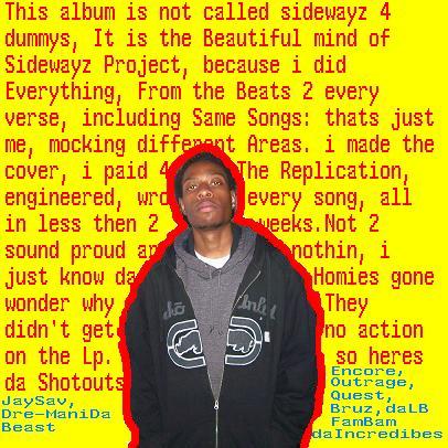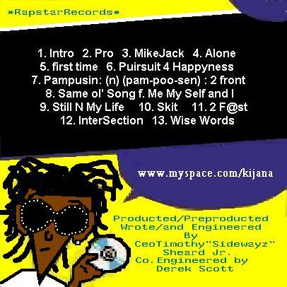 [color="red"][/color] My name is [b]Sidewayz[/b], Timothy Sheard, age 22, unsigned act. Looking for Distribution, Lable, or even an artist deal. Song writer, rapper, Preproduction, and Production; I do it all, even filmed and directed Music Videos. I've been doing music since the age of 15, I recorded my First song with [b]Blackmarket Records[/b]. Since then i've done work with/for local acts like: [b]da Abyss [/b]with singer [b]Radio[/b], [b]Ike Dola [/b]from [b]Keak Da Sneak's Farm Boys[/b], The [b]Darkside[/b] with [b]102.5's Future Flav Show Dj Wayne[/b], [b]PeeWee[/b] from former group [b]Digital Underground (Tupac and Shocke G/Humpy Hump's[/b] First group), [b]Hot One Records, Savcity Entertainment, and M.O.E.[/b] Proformed at a number of clues like: [b]The Caberet, Shady Brady's, juneteenth [/b]park in East Poleato, and half time contest for the [b]And One game [/b]in the [b]Arco Areana in Sacramento [/b].