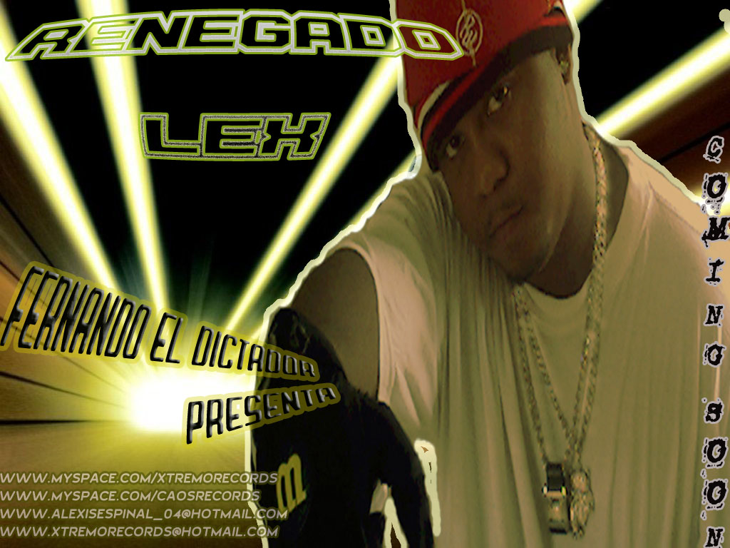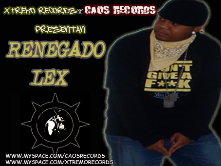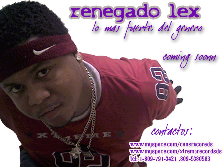 RENEGADO LEX ES UNA DE LOS ARTISTAS MAS DIVERSOS EN ESTE JUEGO NACIDO Y CRIADO EN REPUBLICA DOMINICAN LA CAPITAL SANTO DOMINGO LLEVA UNA TRAYECTORIA DE MAS DE UNA DECADA ASIENDO UN SINNUMERROS DE LOGROS Y AVANCES EN SU CARRERA. PERTENECIENDO A LA COMPAÑIA DE RAP Y REGUETON XTREMO RECORDS COMPANY Y SINEDO EL C.E.O DE CAOS RECODS ESTE MC HA ECHO MUCHAS COSAS POR EL GENERO EN LOS ULTIMOS AÑOS, SUS TEMAS HAN LLEGADO AL GUSTO POPULAR EN MUCHAS PARTES DEL MUNDO COMO SON MEXICO,ESPAÑA,USA,PUERTO RICO ,Y OTROS LUGARES MAS. EN LO ADELANTE LO VEREMOS CON SU NUEVA PRODUCCION Y SUS NUEVOS TALENTO DEJADO PROBADO K ES UO DE LOS MEJORES EN ESTE JUEGO PRODUCIDO SIEMPRE POR LA MANO MAJISTRAL DE FERNANDO EL DICTADOR ES MC SERA EL BOOM CON SU DISCO PA EL 2008 MORE ABAUT DE RENEGADO LEX WWW.MYSPACE.COM/CAOSRECORDS WWW.MYSPACE.COM/XTREMORECODS WWW.ZORPIA.COM/RENEGADOLEX