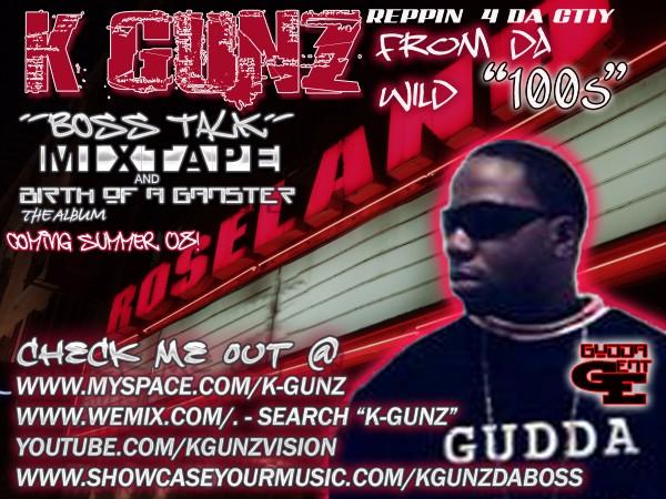K-GUNZ is a up in coming rapper out of city of chicago.Gudda Gang is lead by rapper /producer/ceo K-Gunz. K-GUNZ has a unique style,which steps outside the the unauthentic. losing 2 many members 2 da streetz gunz has his team on his back to make it out an he will. Producing all of their music and promoting with fans in chi. NY. wi. ind. ga. tenn. tx. miss. mich. and iraq B4 MYSPACE he is determined to make it. HE GRIND DA WORLD WHILE DA GANG GRINDS DA CHI. K-GUNZ has passed out over 5000 cd's in the city of chicago and over 2000 cd's in other states gunz has songs like thumpaz and in da hunidz that has his buzz in chicago crazy and due to the ruff life he'e had and by people he grew up around seeing his grind his respacted by all 4 his beats and lyrics and 4 his hustle go check out k-gunz @ www.myspace.com/kgunzdaboss