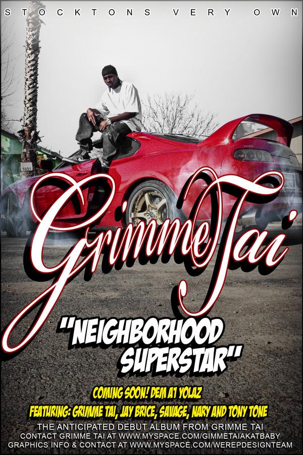 Born Tai Earnest NOW SR. 1986, this new artist goes by the name of Grimme Tai was born and raised in stockton.. Being the youngest of his family, only had one parent to provide for him and push him on to persue music rapping makeing great beats and also singing!!.. hes doin it all!! His first song ever recorded was 'A Mothers Love' which he dedicated to his mother, which his mom also sings and they plan on working on a song together sometime this year.. Grimme tai has been rapping and writing since age 12 and recording since age 17, Grimme tai dureing high school beat three rap battlers to face off against the champion in high school.. In high school he was known as 'Chocolate man' now goes by the name Grimme Tai still undecided?? ,and singing name Tbaby.. Doing shows in Stockton,Sacramento,Modesto and Atlanta GA from Clubs to birthday partys to weddings and high school assemblys.. Hes done over 30 shows promoting himself, hes done shows wit major artist, Chingy,D-lo,Kafani,lil fizz and V.i.c, and has and is looking 2 make a major change in music if working with the best and real people..Grimme tai haveing two kids, said ''this gives him more reason to not give up!! on what he loves best because now he has children that loves music'' Grimme tai has quoated his first album ('Neighborhood Superstar') is not really his first, because of low budget of pushing albums, but is now working on his NEW abum!! and hopes to turn heads doing it.. Tai has started his own group called; Dem A1 YOLAZ (BOYZ) dat dat include artist Jay brice,Macknifisent and Tony Hill and are working hard together.. 'Grimme tai quoats 'Music?, this is my dream and my life,if i cant make it doin music, where does god need me next?.. Grimme tai will not be hated on.. he will keep pushing, and makeing hits till hes on A1 TOP!! look out for him!! hes not stopping!! Grimme tai aka T baby Booking contact 209-570-6260 E-mail:[email protected] THANKS!!