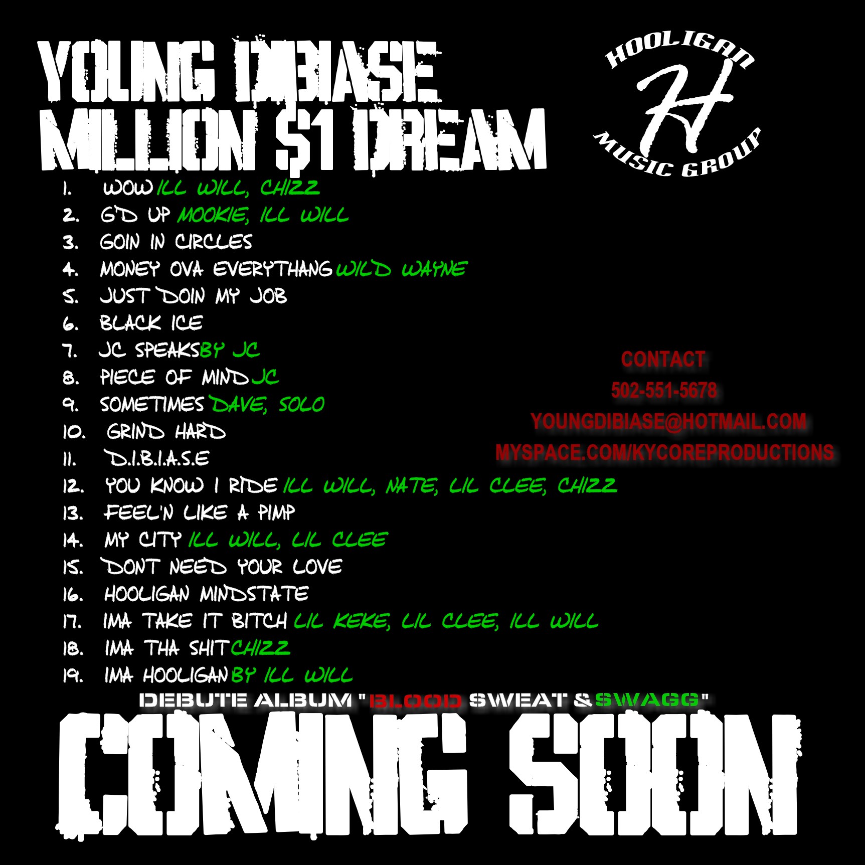 Brought into the world May 28th, 1984 as Cory Smith, but "Young Dibiase" has always been an appropriate name for the unique individual. Dibiase was diagnosed with Sickle Cell at birth. Realizing he has to work twice as hard, the blood disorder has proven to be a successful motivation in his life and career. The youngest of 5 grew up in a Military based family, and although he was born in Frankfort Germany, Kentucky is his home. Experience with alcohol, drugs, poverty, violence, dysfunctional family issues, and personal health issues at a young age have been the fuel that fires Dibiase's passion as an artist. In 2005 while attending Western Kentucky Univ. Dibiase met fellow producer William "Ill Will" McBroom, they later became partners in ownership of “Hooligan Music Group”. 2006 Dibiase began working on his first project “Just Fury”, a promotional tool for the down to earth Single “Piece of Mind” FT. Bad Boy South/ Block Ent’s R&B Star Justin “JC” Crowder. Since the release of “Just Fury” the artist B.K.A. CORE, officially changed his name to “Young Dibiase” after battling three “near fatal” Sickle Cell Crises in less than a year. Following discharge on December 15th, 2007 Dibiase began recording “Million $1 Dream” symbolizing his strength, motivation, and optimism. The CD hit streets, local stores, and online retailers such as amazon.com and iTunes February 23rd, 2008. Over the years Dibiase has become one of Kentucky’s most promising and well round rounded artists, consistently releasing hit singles, and opening shows for Major Artist. 2010 looks to be the “light at the end of the tunnel” as Dibiase plans to breakthrough as on of the South’s new Regional artist. As of right now Dibiase plans to release “Million $1 Dream 2.0” in March 2010, Hosted by KYMP KAMP DJ’s own DJ Dizzie, which will also be followed up by Dibiase’s Debut album “HOOLIGAN MUZIK” in the summer. DISCOGRAPHY: "Just Fury" Mixtape (Released March 19, 07) "Million $1 Dream" Mixtape (Released Febuary 23, 08) Million $1 Dream 2.0 (Drops March 2010, Hosted by Dj Dizzie) Debute Album "HOOLIGAN MUZIK" (Set to Release Summer 2010) LINKS http://www.Facebook.com/YoungDibiase http://www.Twitter.com/YoungDibiase Http://www.Myspace.com/kycoreproductions http://www.ilike.com/artist/CORE+AKA+YOUNG+DIBIASE Http://www.Soundclick.com/coreproductions http://www.Showcaseyourmusic.com/CORE
