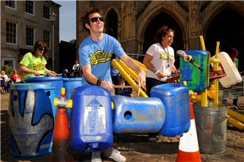 Weapons Of Sound, the original purveyors of junk percussion started banging their junk in January 1993. Since then Weapons Of Sound have been booked to play a variety of educational, environmental awareness, festival and corporate performances and workshops locally, nationally and internationally..........weddings and Bar mitzvahs included. Performance highlights over the years include the opening of the Commonwealth Games in Manchester 2002, Heineken Cup Final 2007, Limburg Festival, The Sproai Festival in Ireland, Champions League Final, Queens Jubilee Party at Buckingham Palace, Greenbelt Festival and numerous cabaret and late night performances at both Glastonbury and Reading Festivals. WOS have played live performances in clubs in Plymouth and Portsmouth and Exeter's 'Timepiece' to name a few. Weapons Of Sound have baffled customs at many airports with their unusual array of recycled instruments. Airports and planes in places like China, Seychelles, Spain, Portugal, Israel, France, Egypt, Germany. . . . . . and Exeter have transported the band and their gas pipes, sinks and shopping trolleys. WOS have launched products such as the XBox in Cannes and Miller Lager in Shanghai and have bashed out their beats and reminded people of the environmental message for Surfers Against Sewage, the Eden Project and their local Recycle Devon campaign. WOS have recorded albums and individual songs at Maida vale Studios, Sawmills Studio's, Propagation House and Deep Blue Sound Studios. Video footage and specific projects have been filmed at The Hospital in Covent Garden (London). Albums include Tank Top EP, Keep Britain Funky, Play Things and Bang On. WOS are currently working on new tracks for the next album. WOS have appeared on Radio 1 and local radio stations and have TV appearances that include (Sky Music Channel) Musfalsh, This Morning, Blue Peter, BBC Live and Kicking and their music appeared on BBC Dramas. Educational environmental awareness programmes for children include BBC Music File, Cats Eyes, The Best of Friends, Boiled Egg and Soldiers and The Slammer and have been part of BBC Music Live events. Weapons Of Sound recently played at the Business In The Community Awards 2007 at The Royal Albert Hall for HRH Prince of Wales and Al Gore., who hailed WOS as the UK’s greenest band!! Weapons Of Sound.......................the best 'junk funk' in the nation!!!