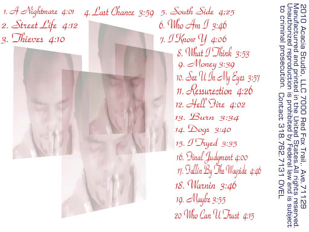 Warnin!!!!!! This message may be too strong for those who can\'t handle the truth. what a sight it will be when the King return in the CLOUDS of GLORY. Warmin!!!!!! I didn\'t come to bring you message of peace, but of the upcomin judgment, and the wrath of God follows. What a sight it will be when the sky scrolls back like a curtain when all the Angels in heaven will decend out of heaven, and gather the elects from all four corner of the earth. And the dead in Christ shall rise 1st, and those that are on the ground in Christ Jesus will be caught up to meet them in the air, Oh what a glorious sight that will be. The last hour of Judgment has arrived and the wicked will be stubble. A Warnin to all the world, Jesus is about to return. I have the testimony of Jesus and I will hold on to the truth according to God\'s will. I bring you the truth about my Lord and Savior. The beast will deceive many people around the world with a false system of worship, causing people to believe that Sunday is the day of worship. Saturday is the 7th day that God had declared Holy, for the Roman Catholic went about changin God\'s Holy day, and the system will keep you in darkness and from the truth of God. You will be force to worship God on Sunday, the 1st day of the week. God said if you love me, keep my commandments, and let no one deceive you, Matt: 15:9 said that, And in vain they worship me, teaching as doctrines the commandments of men . Watch out!! The pope will set himself up as God, the time will come when the son of perdiction will come on the seen, and make himself known to all the world, as he sit himself upon his throne. You can find my cd on Cdbaby.com and Itune.com