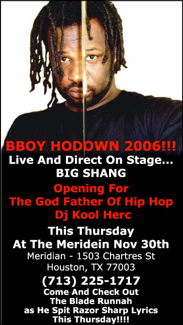 BIG SHANG BIO One of Washington, D.C.'s finest, BIG SHANG realizes that there's not a lot to know about D.C. There's been little success in the past for D.C. with artist Question Mark Asylum and probably the most successful rapper out of D.C., Nonchalant, who brought you "5:00 in the Morning," D.J. Cool "Let Me Clear My Throat" was a huge hit, and E.U. Classic doing "Da Butt" was also very successful, but what else does D.C. have to offer? The answer to your question - Big Shang - a multitalented producer and writer who lived all over the metropolitan area of D.C., V.A., and Maryland. He started his career in 1989 and has not, no, could not be stopped since. He's a 250-pound wrecking ball, a powerhouse that's a fore to be reckoned with and has a no-nonsense hardcore East Coast style with a special twist. In 1993, Big Shang moved to Houston, TX to live with his father. He is currently staying in Houston and he adds a hint of southern twang to his hardcore smashmouth style. With songs like "Blade Runna" and "Dread Lock Rasta," he's bound to be the next big thing. With three independent albums already under his belt (Mic Controla, Washington Bullet, and Jessie James), he shows no signs of stopping. He's already received praise for his Washington Bullet album and got an article written about this album in the Houston Daily Cougar (the official college newspaper at the University of Houston). He received a loyal fan base from his self-produced 2003 debut(Washington Bullet) and he has distributed his 2004 debut "Jessie James" worldwide. Shang also recieved an interveiw in the award winning WWS Magazine and has done countless number of show since then. Shang was handpicked to take the place of Wu Tang Clans "Ghost Face Killah" after he cancled a show at the Bench (Houstons premiere hip hop venue). Shang has also dabbled in club promoting. He has arranged and hosted 3 successful shows so far, and he continues to promote shows. Shang is now currently working on his new project "Natural Disaster," which is scheduled for release in the first quarter of 2007. So, remember his name and watch out for him in the near future. He's the Washington Bullet and he's blasting through the speakers nationwide.