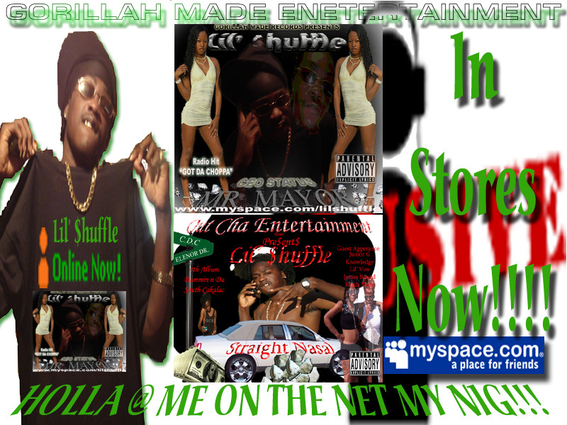 South Carolina/Atlanta Ga-based gangsta rapper Lil' Shuffle . After beginning his performing career while in his teens, he released a 2004 album on New Beginning Records. "H-Town (Trouble Mind Boys). He eventually crossed paths with Out Cha Entertainment Records label owners Rell Smalls, who issued 2005 Album "STRAIGHT NASAL"; the album became a major underground hit, and set the stage for the release of 2006 MR. MAYOR ALBUM. In 2006, with Shuffle's popularity growing, Straight Nasal's was reissued nationally. Lil Shuffle eventually open up acts for major artist's such as B.G; Chyna Whyte Yo Gotti & ETC. Shuffle worked major local artist out of South Carolina such as Fat Boy; Marly Mar; Lost Society just to name a few. In 2005 he left Out Cha Entertainment and signed to the Gorillah Made Records, with whom he recorded a quick album. The album went through all the southern areas and a year later he was back on on the grind and releasing Mr. Mayor, which featured the chart-topping hit "ALL I CAN DROP." The 2006 "NORTH NORTH" single also from the Mr. Mayor album that was another big track, and Lil' Shuffle was in in a variety of interviews from magazines to radio stations etc.. ~ Kiesha Simmons, All Music Guide HOLLA @ THE COMPANY FOR FURTHER DETAILS @ SongDownloadPriceGot The Choppa RingTone$.99Trap Boy Fresh$1.99Ringtone store powered by iSOUND.COM